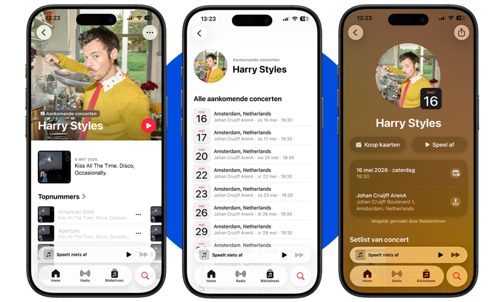 Met iOS 26.4 introduceert Apple Music een vernieuwde full‑screen album‑ en playlistervaring. Concertinformatie, die voorheen alleen op specifieke plekken te zien was, is nu structureel aanwezig in de app. Op basis van feedback van fans wordt concertontdekking zo eenvoudiger én beter schaalbaar.