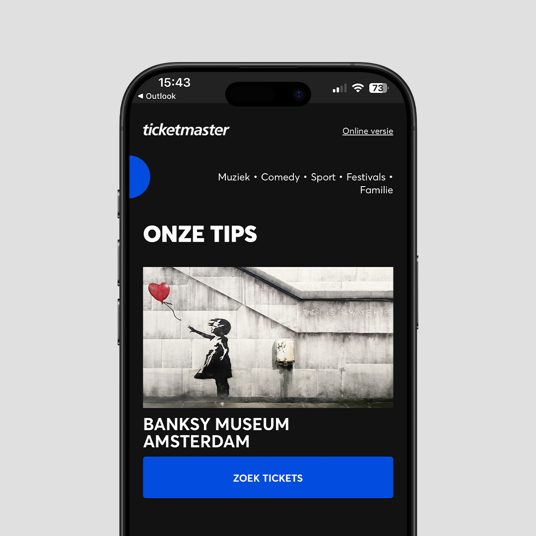 Met onze wekelijkse nieuwsbrief bereiken wij 1.7 miljoen fans. Ook verzenden we nieuwsbrieven die volledig gericht zijn op jouw evenement, met handmatig opgebouwde content, een zorgvuldig samengestelde doelgroep op basis van Ticketmaster-data via slimme tooling en jullie eigen targeting-suggesties.